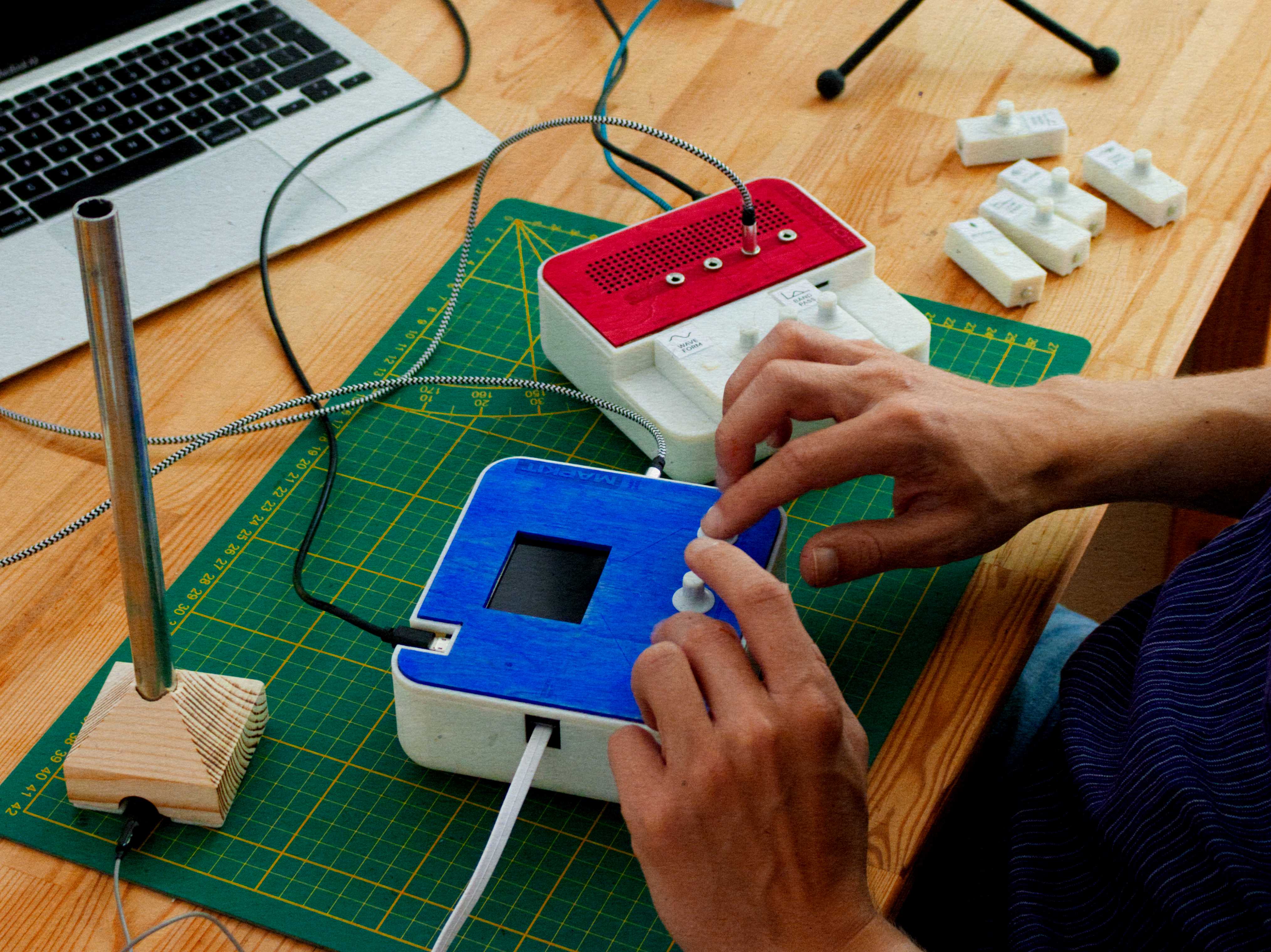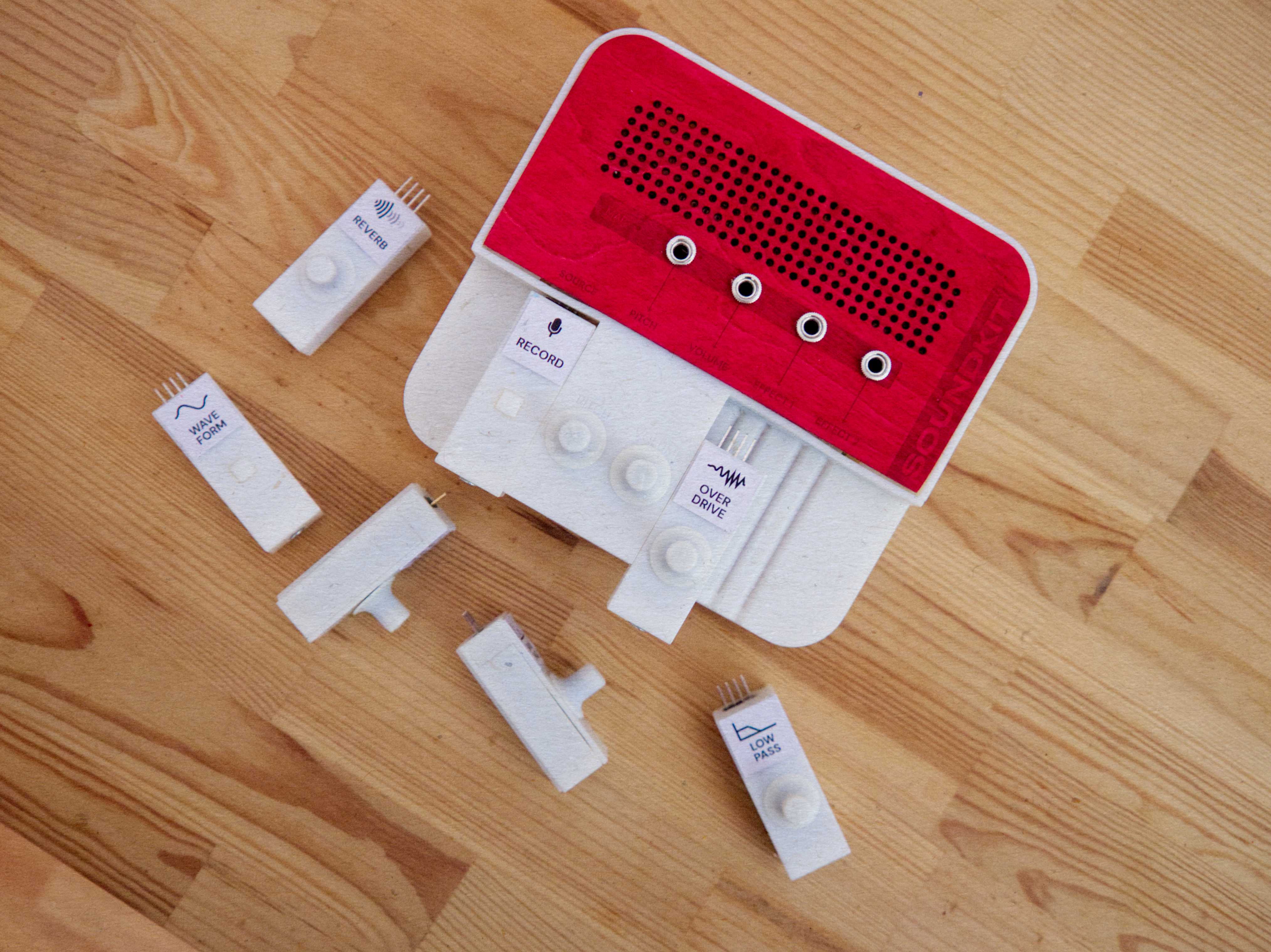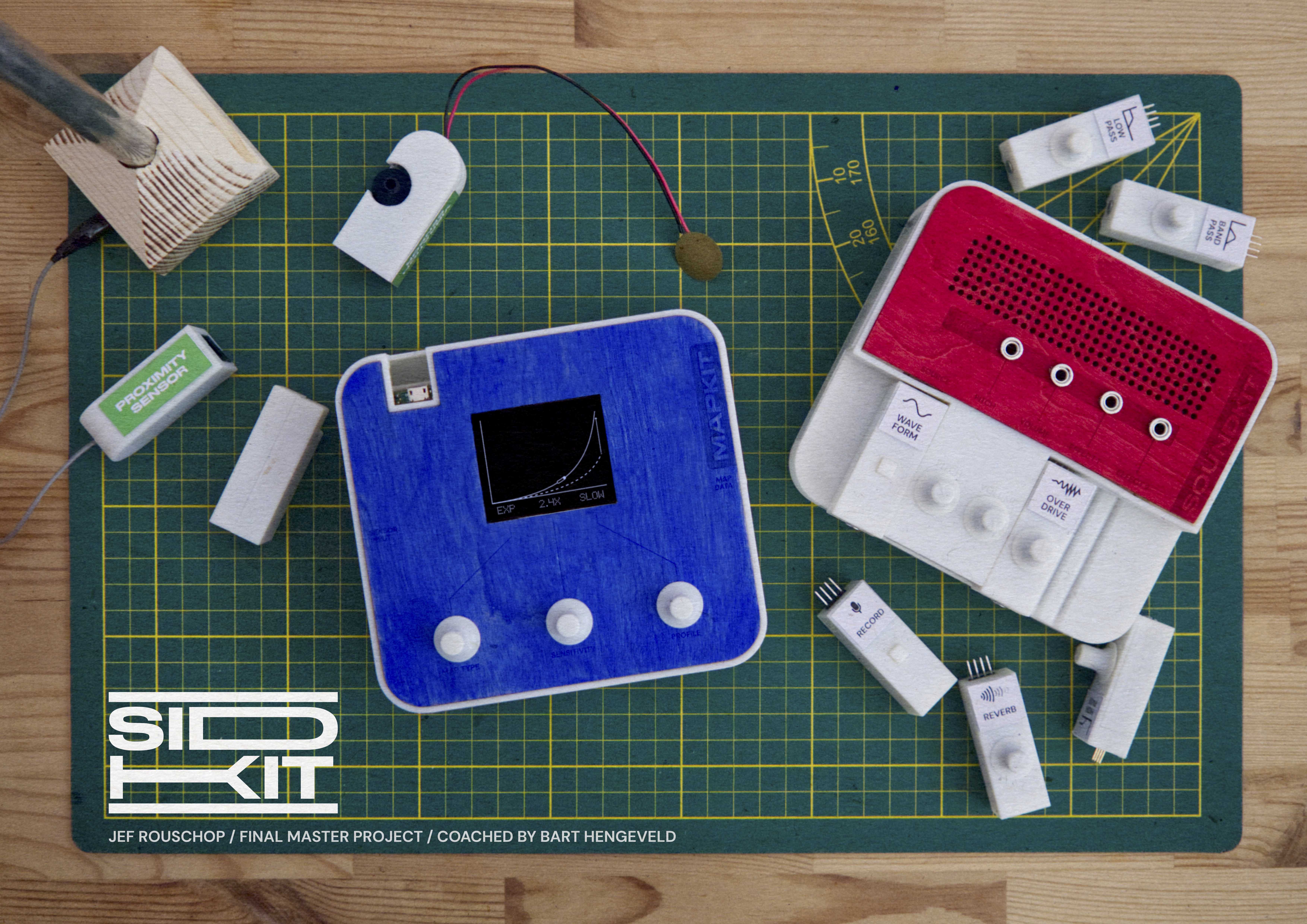 SIDKIT was inspired by my own 4 years of experience as interactive sound designer during my Master and Bachelor studies. The design process involved research-based scoping of the design space, substantiated by a series of interviews & workshops on the topic. These pointed towards an absence of proper beginner-level tools for sound, and a general lack of tools that enabled prototyping with sound in a designerly manner. The technical development of SIDKIT stood central and was continuously running in parallel to other activities, involving circuit design & assembly, technology prototyping, and signal processing.